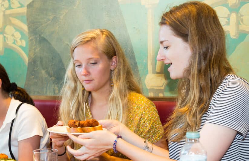 For local residents, savoring tapas is a culturally important and typical way to spend an evening. Classic dishes include items such as tortilla española, patatas bravas, bacalao, cheeses, olives, or jamón. After sharing a selection of authentic tapas family-style, finish off the evening with a treat that’s been satisfying the sweet tooth of Spaniards for hundreds of years—churros y chocolate!