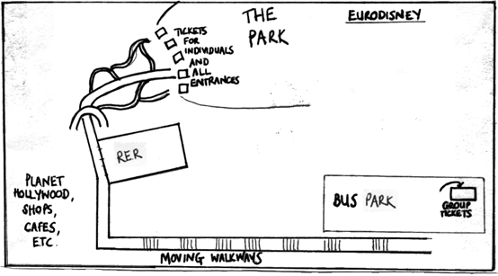 If collecting the tickets on arrival, note that the GROUP ticket office is way back in the bus car park. You will need to leave the group by the RER station while you go and collect the tickets (this will take 15-30mins).