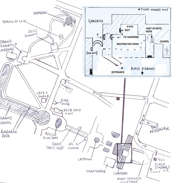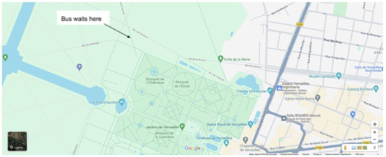 Your driver can only stay for 20 mins in the Place d’Armes bus park without paying so if he is meeting your group at the Trianon bus park he should go directly there. (If the group has bikes booked this is a must). Have cash for the bus drivers Trianon parking. Otherwise, the driver will need to wait for you here. Not good in rain as it´s a long walk up from gardens.