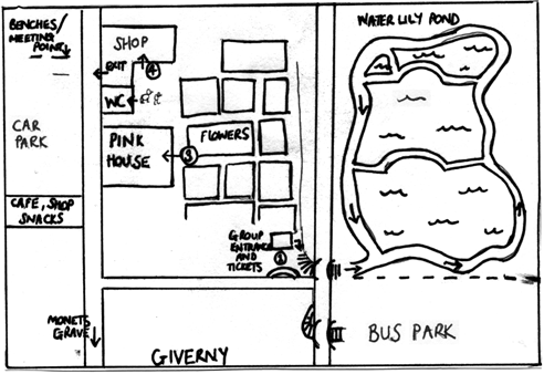 Set down in the bus park on the right as you enter the village (before you come to Monet’s house). Take the underpass. On the other side of the underpass are some toilets if needs dictate. Turn right and lead the group 150m along the pavement to the group entrance which will be on your left.