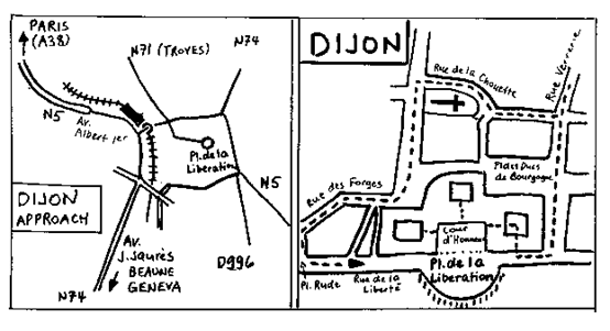 Coming from Geneva, take exit 2, Dijon Sud, then the next exit, which will lead you to the N74. Take this towards Dijon and follow signs to Centre and Gare SNCF (see map).