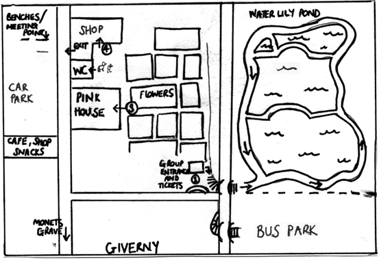 Set down in the bus park on the right as you enter the village (before you come to Monet’s house). Take the underpass (under the road) turn right and lead the group 150m along the pavement to the group entrance which will be on your left.