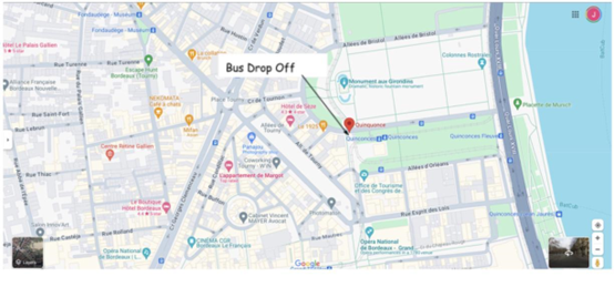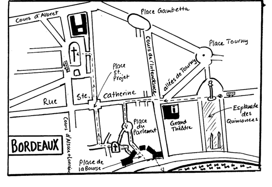 Ask the driver to take you along Cours Aristide Briand, Cours d’Albret, Place Gambetta, Cours de l’Intendance, Place de la Comédie, Cours 30 Juillet and Esplanade des Quinconces, where you start your Walking Tour (see map below). Tell the driver to pick you up at the Cathedral one hour later depending on your schedule – Bus Parking in Allee de Bristol. If you are taking the TGV do not leave the Cathedral later than one and a half hours before the departure of your train.