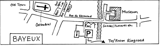 Set down in the coach park (see map). Lead the group down the path, past the free, public toilets. There are more to the left of the ticket office in the building that houses the Tapestry). Turn right onto rue de Nesmond, then first left. The Tapestry complex is on your right hand side.