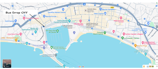 Best would be the Quai des États Unis but you will have to get off the bus quickly. Some drivers won’t stop here.  If they do, from here, walk your group through the archways into the Cours Saleya (centre of the old town). Most mornings there is a wonderful fruit and flower market here UNTIL 1PM except Sundays when it is a flea market.. Also many, many cafes and restaurants. The old town is perfect for exploring. There are loads of little streets full of shops and hidden photo opportunities. Aim for Place Rosetti and Fenocchio’s ice-cream in the old Town Square! Not far, the Cathédrale Sainte Réparate is beautiful too. And really worth going in. Baroque style.