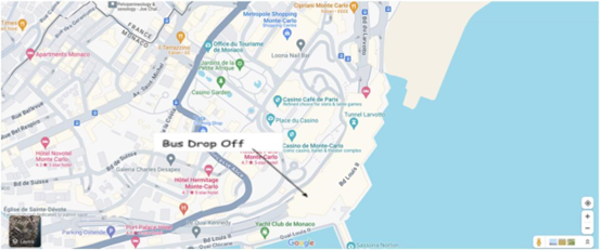 Driver drops you and group under new conference center below Casino gardens. The 3 digit number on your entry permit will be needed to call your bus back. Take group via steps, a tunnel and elevators to the Casino terrace.  When you arrive at the Casino Terrace turn left, and walk up stairs. The Casino is over to your right. After the visit, reverse procedure.