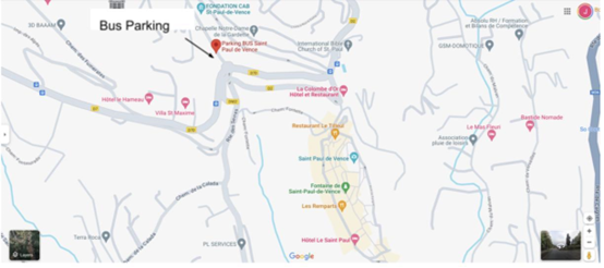 Indicate the direction to the Maeght Foundation – up the hill, away from the main road you have just turned off, take the path on the left and continue to the top of the hill. It is about 15 minutes’ walk from the bus park – great to visit for anyone interested in modern art. If they want to visit the Foundation, advise them that they will not have time to visit St Paul as well.