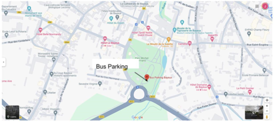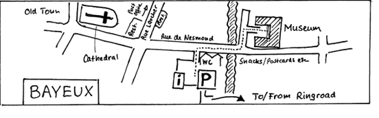 Set down in the coach park (see map). Lead the group down the path, past the free, public toilets. There are more to the left of the ticket office in the building that houses the Tapestry). Turn right onto rue de Nesmond, then first left. The Tapestry complex is on your right hand side.