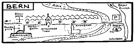 Follow signs to city centre and park just up from the Bear pit (Bärengraben). There are toilets here downstairs in the information building. Make a rendezvous for departure, and tell the group if they will be coming back to the bus on their own. If the GL is not comfortable with this, lead the group into town, make a meeting spot for example at the Zytglocke, and walk back to the bears together.