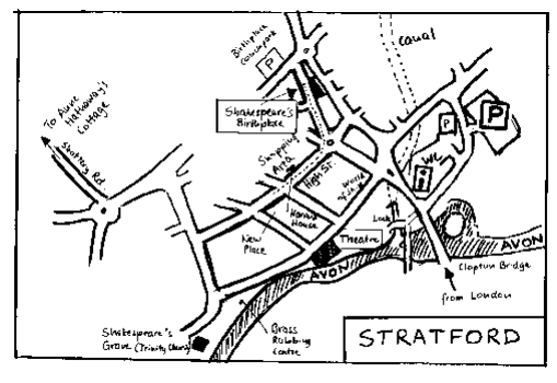 Over the Clopton Bridge, left along Waterside with the RSC on your left, head towards Holy Trinity Church. At junction turn right (church is on left) turn first right into Church Street which leads into the High Street and then to the Birthplace Coach Drop Off Point, Windsor Street. Inform group what time to return after lunch.