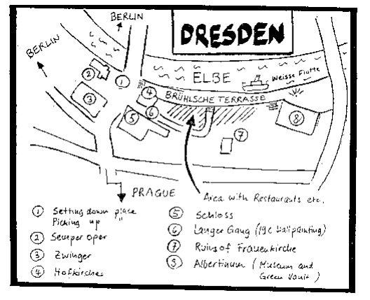 Give some free time for lunch. There are several places between the Hofkirche and the Albertinum. Other possibilities in the Alte Markt (Galerie – shopping centre) and on Wilsdruffer Strasse.