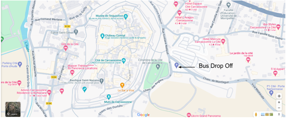 Set down on the bus drop off (see map) and make a rendezvous with your driver for departure. There are relatively good public toilets on your left as you walk towards the entrance – Porte Narbonnaise.