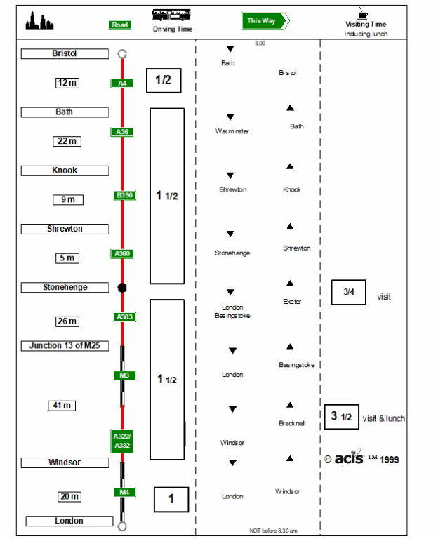 · For itineraries in reverse, do not leave before 08.30, as Windsor does not open until 9:45 am. (If hotel is in west London)