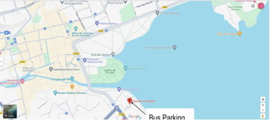The bus parks on the lakeside just off the Quai de Bayreuth and if you walk down to you left (with the lake on your right) you come to the town and the departure point for boat trips.