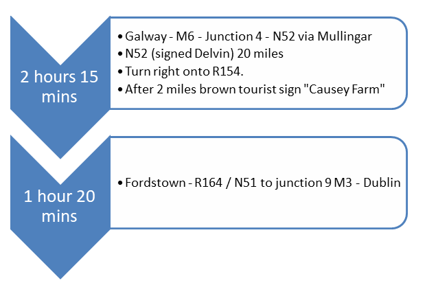 - A straight drive from Galway to Causey Farm takes roughly 2 hours 30 minutes. This is allowing for a clear run, and as there is a good amount of travelling on country roads that is not guaranteed. Warn people about this the day before.