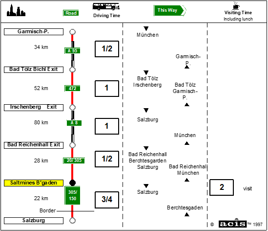 The salt mines are on the Berchtesgaden – Salzburg road (B305) on the far side of the river.  Follow signs to Salzbergwerk and park in the bus park.  Bags are a nuisance on the visit – ask them to leave them on the bus.  Walk the group to the entrance and get them to position themselves in the line for groups whilst you get the tickets.  Go directly to the cash desk, and buy tickets, if not paying by voucher and time has not been reserved in advance, do not forget to ask for a receipt.  Go back to the head of your group, but do not distribute the tickets yet.