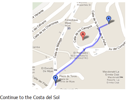 · The bus drop off and pick up is in front of the Tourist Information Office on Calle de la Virgen de la Pena. The bus cannot stay here and will have to park in the bus park on the lower street behind the Tourist Office. Driver follows Av del Compas to the left and then takes first left to long stay bus park.