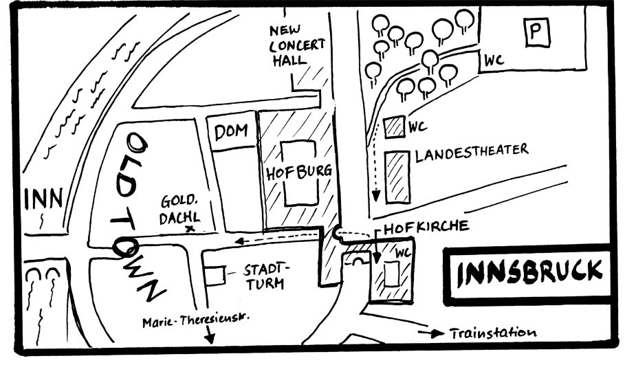 Walk them through the garden and pause to point out the front of the Hofburg. Take them next to the Hofkirche to see the tomb of Maximilian I. There is now an excellent included multimedia introduction show to the Hofkirche. as well as free toilets.