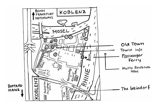Start your walking tour at the Deutsches Eck. Follow the TM notes for your walk through the old town. You can keep your tour pretty informal as the aim is to orient your group. Give them enough time to explore the streets and squares (and shops) on their own.