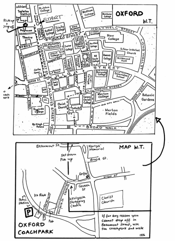 Set down and pick up in Beaumont St. and arrange time/place for departure. If you decide on the Martyrs Memorial impress on group that they will be making their own way back to the coach from Christchurch so to pay attention to route and find bearings, and they need to be on time. Otherwise make a meeting spot on Cornmarket and walk to the coach as a group.