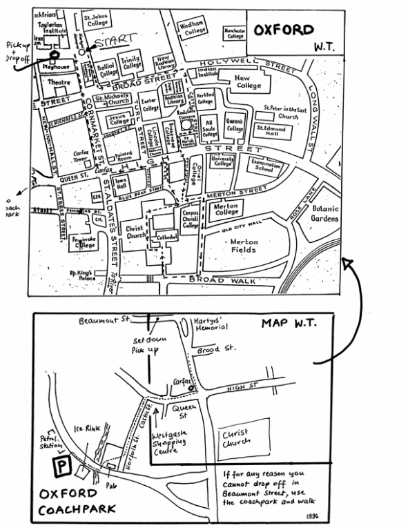 Set down and pick up in Beaumont St. and arrange time/place for departure. If you decide on the Martyrs Memorial impress on group that they will be making their own way back to the coach from Christchurch so to pay attention to route and find bearings, and they need to be on time. The city does not like coaches parking in this area.