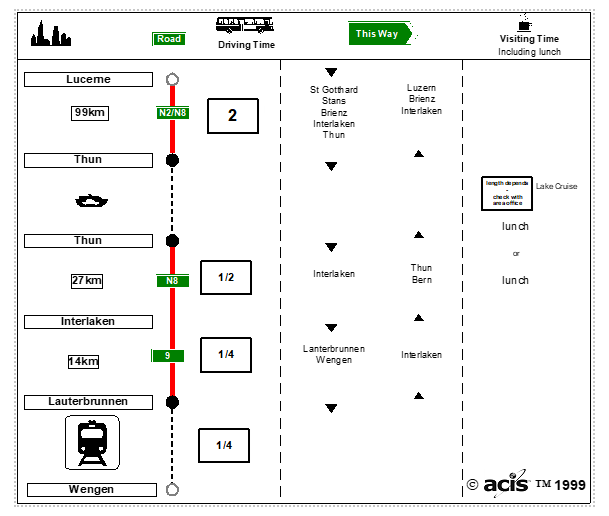 - Depending on timings you could have lunch in Thun or Interlaken and give your group some free time there. You may take the 2-hour cruise from Thun to Interlaken or reverse.