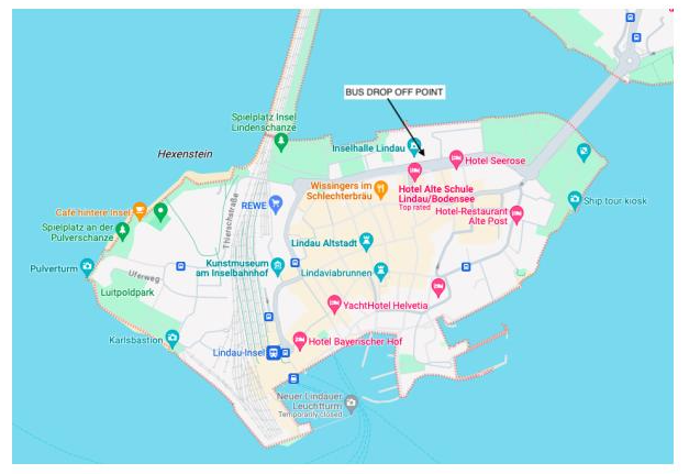The island town of Lindau is very small. Buses are now permitted to drop off and collect on the main island, outside the Inselhalle (GPS address: Zwanzigerstrasse 10). There are also pay WCs here. The driver must still park on the mainland. Walk the group through the walls to the market square and give free time for them to explore on their own and get lunch – there are plenty of cafes and restaurants. Most