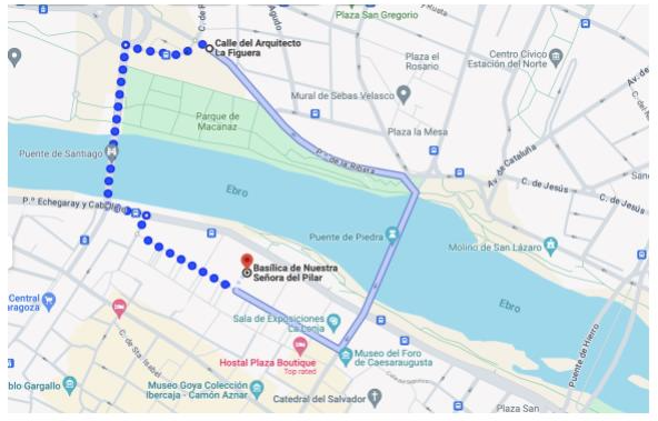 On arrival at Zaragoza, on the other side of the river at the bus park off Calle del Arquitecto la Figuera and arrange a rendezvous time with the driver. Walk the group to Plaza del Pilar and point out/explain the following: