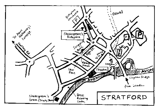Set down in Birthplace coach park (Windsor St.). Walk group to Centre and Birthplace (Henley St.). Warn them to take care when crossing Windsor Street.