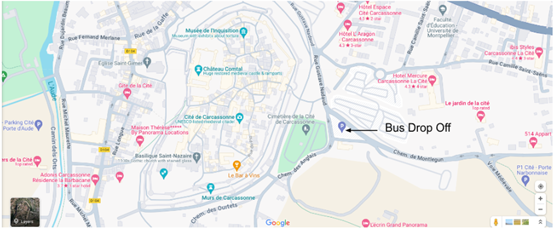 Set down on the bus drop off (see map) and make a rendezvous with your driver for departure. There are relatively good public toilets on your left as you walk towards the entrance – Porte Narbonnaise.