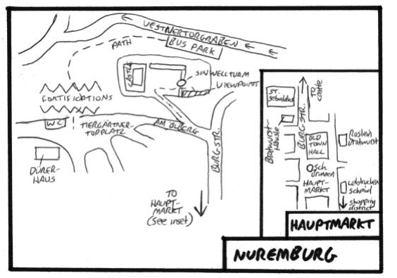 Upon arrival in Nuremberg, you will have to drop off either at the Grasersgasse (adjacent to the German National Museum) and walk the 20 minutes into the town centre; or drop off at the Vestnertorgraben north of the Castle (a slightly shorter walk but a long drive to reach and very steep on the return). Walk the group to the Hauptmarkt and Schöner Brunnen. The fountain makes an ideal meeting point – do not expect the group to find their way back to the coach on their own.