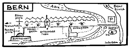 Follow signs to city centre and park just up from the Bear pit (Bärengraben). There are toilets here downstairs in the information building. Make a rendezvous for departure, and tell the group if they will be coming back to the bus on their own. If the GL is not comfortable with this, lead the group into town, make a meeting spot for example at the Zytglocke, and walk back to the bears together.