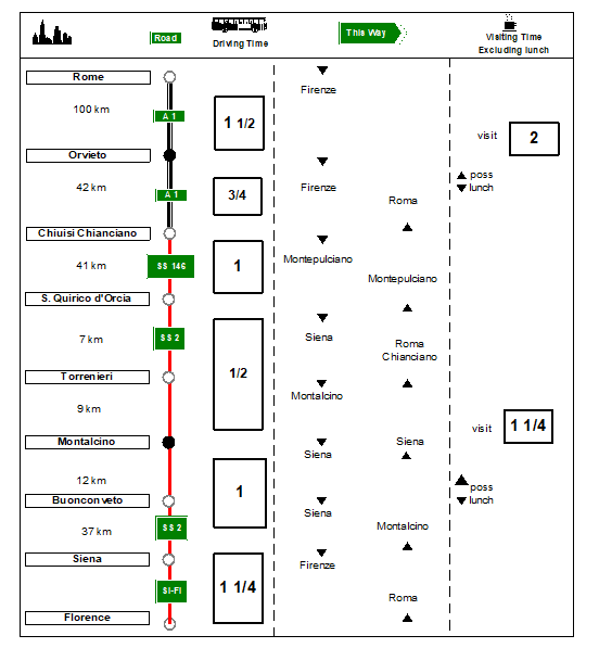 A detour of 8km South of Montalcino to visit the Benedictine Abbey of S. Antimo is very well worth it. Add an extra hour for this (no toilets at the Abbey).