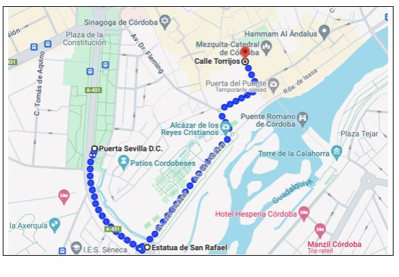 On arrival in Córdoba you will be dropped off by Puerta Sevilla. (see map). Arrange a rendezvous time (guided visit takes about 1.5 hours and then you need to allow time for lunch) and place with the driver (make sure you take the driver’s mobile number in case you are delayed as the bus cannot wait there indefinitely). When you get off the bus, lead your group down to the right ( following the old Alcazar wall on your left ) When you reach the roundabout at the bottom take a left and continue with your group until you reach the triumphal stone arch on your left. Go through it – the mosque is now visible in front of you. When you reach it walk to the left of it up the hill – this is Calle Torrijos.
