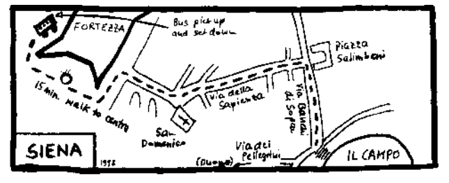 Siena is a very small town and off limits for buses in the centre, so everything is done on foot. Buses need a permit to enter town, which they collect at a checkpoint on the outskirts. The bus can drop you off and pick you up at the Fortezza except on schooldays between 12.15 and 13.45 and from this point you walk to the Piazza del Campo and the Duomo, passing the church of San Domenico where you will find (paying) toilets. Another drop off point is at Porta S. Marco – a steep but short walk to the Duomo.