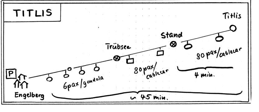 The first part of the ride is in small gondolas from Engelberg to Trübsee (warn them that they do not get off at Gerschnialp, the first station!). Next, a regular cable car takes you up from Trübsee to Stand. The top section, between Stand and Titlis, is in the world’s first rotating cable car. Show them the rendezvous point on arrival at the top.