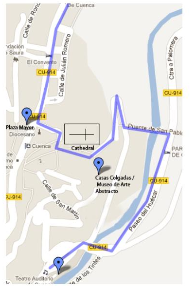 For the sightseeing follow the signs for Hoz del Huecar, Parador, Hotel Cueva del Fraile or “Casas Colgadas.” You will arrive at the coach park next to the huge auditorium. Arrange a rendezvous time with the driver, and then walk the group up across the river and follow a steep road (Paseo del Huecar) with amazing views looking across the river valley onto the Casas Colgadas. Walk across the San Pablo bridge back towards town. Once off the bridge follow the road round and to the left – you will walk under a small archway and you will come to the Abstract Art Museum (located in the Casas Colgadas). Give group 45 mins in the museum then continue to the