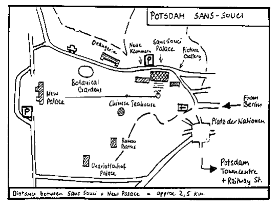 On arrival in Potsdam, follow signs to Schloss Sans Souci. Set down at the bus park which is clearly signed up. The bus waits here.