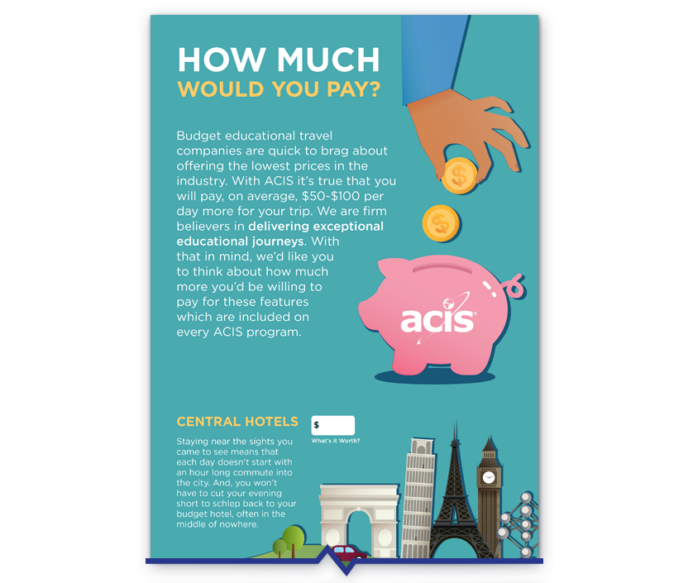 Budget educational travel companies are quick to brag about offering the lowest prices in the industry. With ACIS it’s true that you will pay, on average, $50-$100 per day more for your trip. We are firm believers in delivering exceptional educational journeys. With that in mind, we’d like you to think about how much more you’d be willing to pay for these features which are included on every ACIS program.